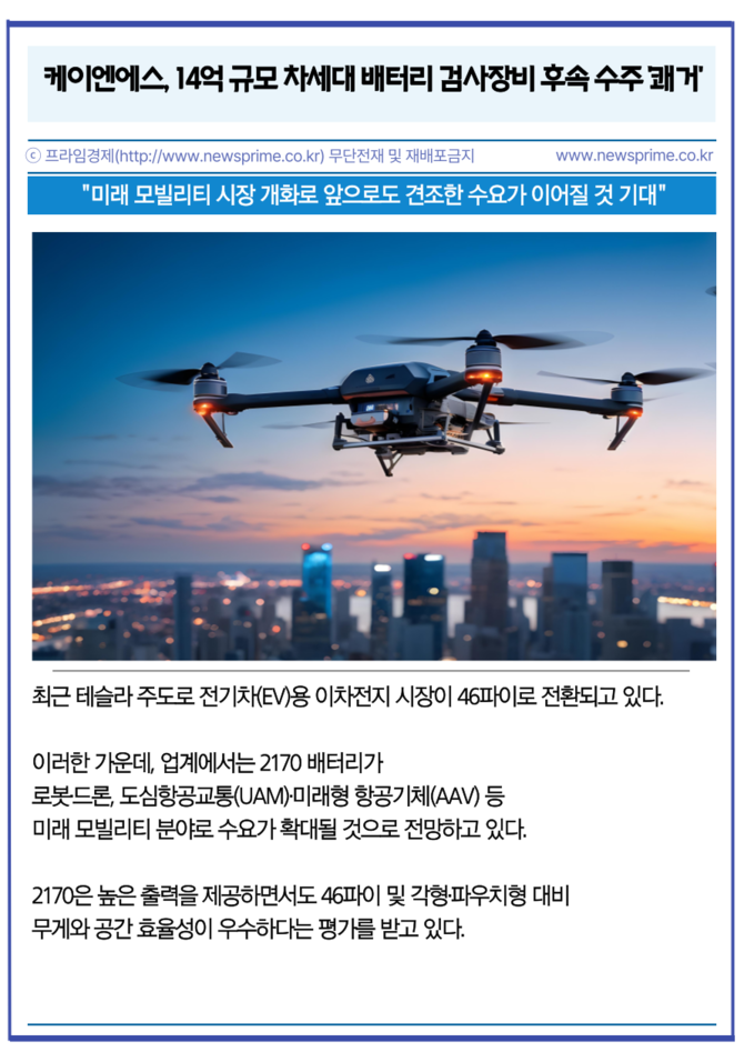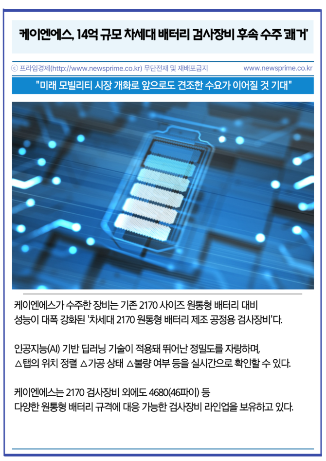 앞서 케이엔에스는 올해 4월 한 차례 해당 신규 검사장비를 전방 고객사에 공급한 바 있다. 케이엔에스가 수주한 장비는 기존 2170 사이즈 원통형 배터리 대비 성능이 대폭 강화된 '차세대 2170 원통형 배터리 제조 공정용 검사장비'다.