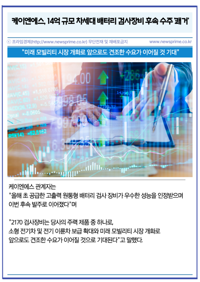 [프라임경제] 케이엔에스(432470)가 개발한 신규 이차전지 검사장비가 우수한 성능을 인정받아 후속 수주에 성공했다.