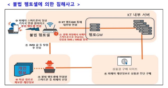 조사단에 따르면 KT 침해사고는 불법 펨토셀 악용과 서버 악성코드 감염이 복합적으로 작용했다. 불법 펨토셀을 통해 가입자 식별번호(IMSI), 단말기 식별번호(IMEI), 전화번호 등 개인정보가 유출됐고, 이를 결제 인증 정보와 결합해 무단 소액결제가 이뤄진 것으로 조사됐다.