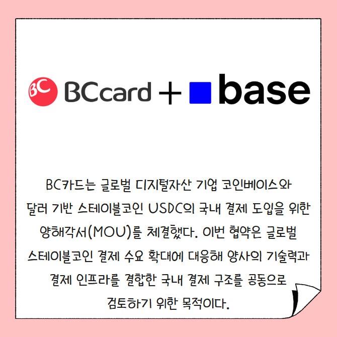 [프라임경제] BC카드는 글로벌 디지털자산 기업 코인베이스와 달러 기반 스테이블코인 USDC의 국내 결제 도입을 위한 양해각서(MOU)를 체결했다. 이번 협약은 글로벌 스테이블코인 결제 수요 확대에 대응해 양사의 기술력과 결제 인프라를 결합한 국내 결제 구조를 공동으로 검토하기 위한 목적이다.