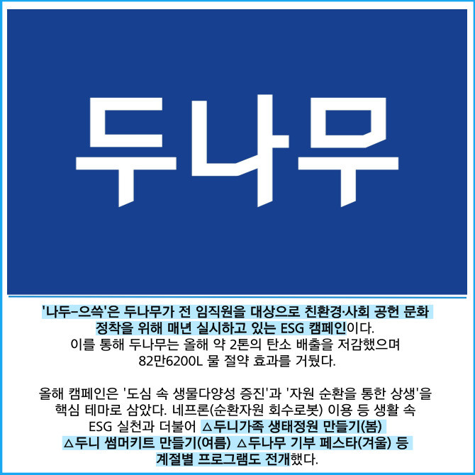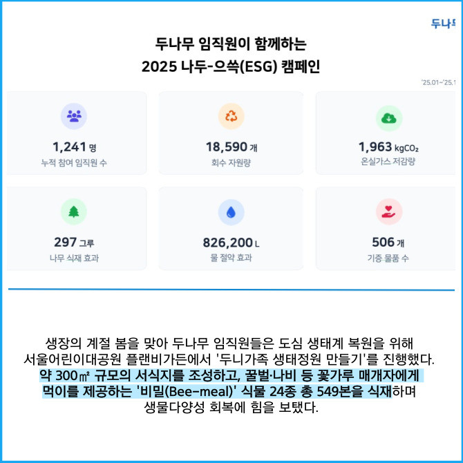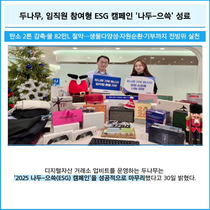 [프라임경제] 디지털자산 거래소 업비트를 운영하는 두나무는 '2025 나두-으쓱(ESG) 캠페인'을 성공적으로 마무리했다고 30일 밝혔다.
