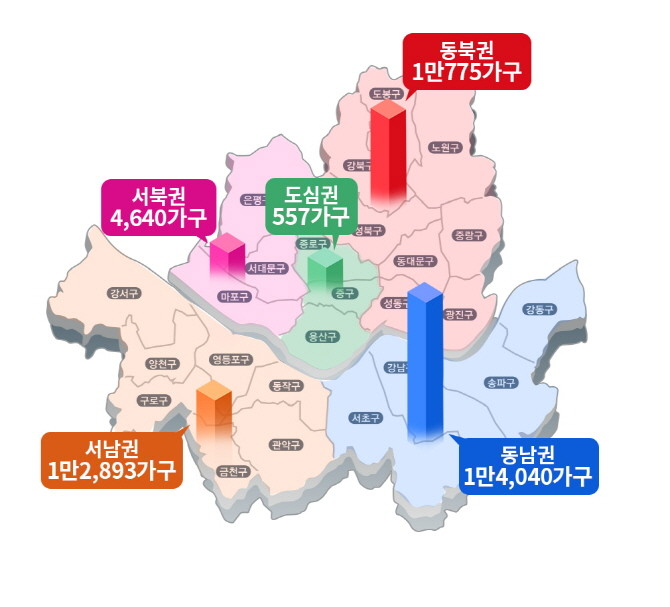 실제 동남권과 동북권, 서남권은 상대적으로 공급이 여유로운 상황이다. 동남권(강남·서초·송파·강동)은 전체 32.7%(1만4040가구)에 달하고 △서남권(구로·강서·동작·영등포·양천 등) 1만2893가구(30.1%) △동북권 1만775가구(25.1%) 등이 입주 체제에 돌입한다. 서울 내에서도 동쪽과 남쪽에 입주 물량이 쏠리는 셈이다.