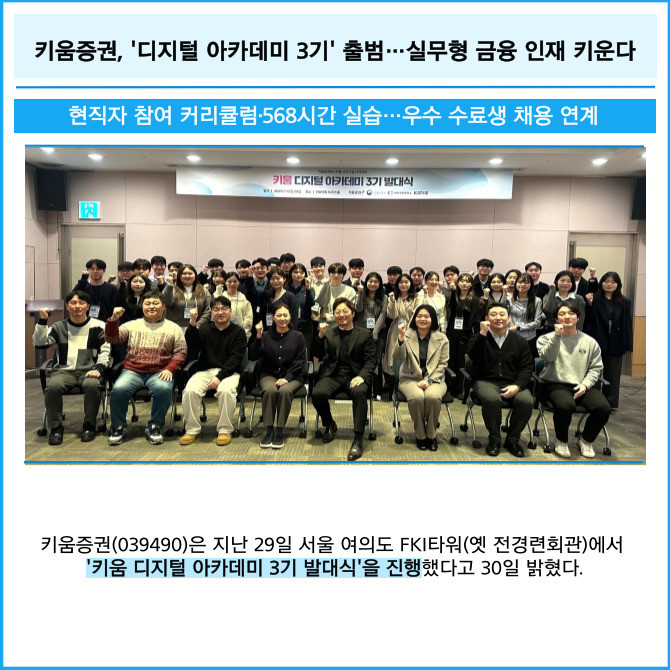 [프라임경제] 키움증권(039490)은 지난 29일 서울 여의도 FKI타워(옛 전경련회관)에서 '키움 디지털 아카데미 3기 발대식'을 진행했다고 30일 밝혔다.