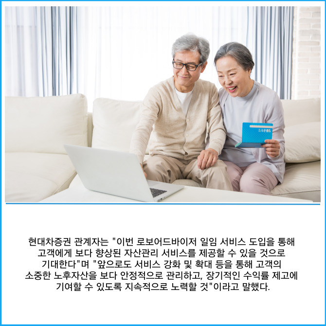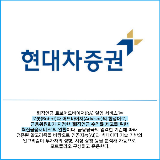 [프라임경제] 현대차증권(001500)은 지난 29일 개인형퇴직연금(IRP) 고객을 대상으로 수익률 제고를 위한 개인형퇴직연금(IRP) 로보어드바이저 일임 서비스를 출시했다고 30일 밝혔다.