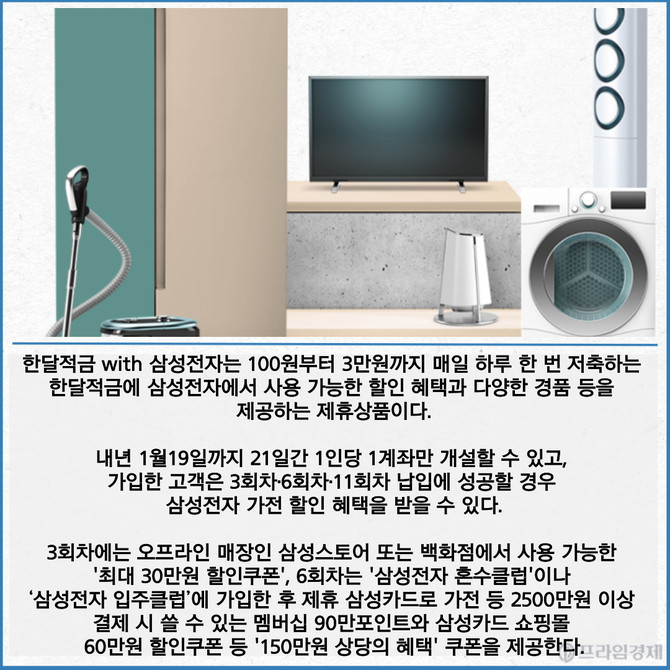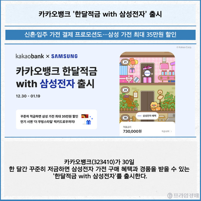[프라임경제] 카카오뱅크(323410)가 30일 한 달간 꾸준히 저금하면 삼성전자 가전 구매 혜택과 경품을 받을 수 있는 '한달적금 with 삼성전자'를 출시한다.