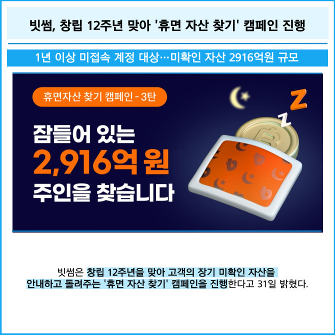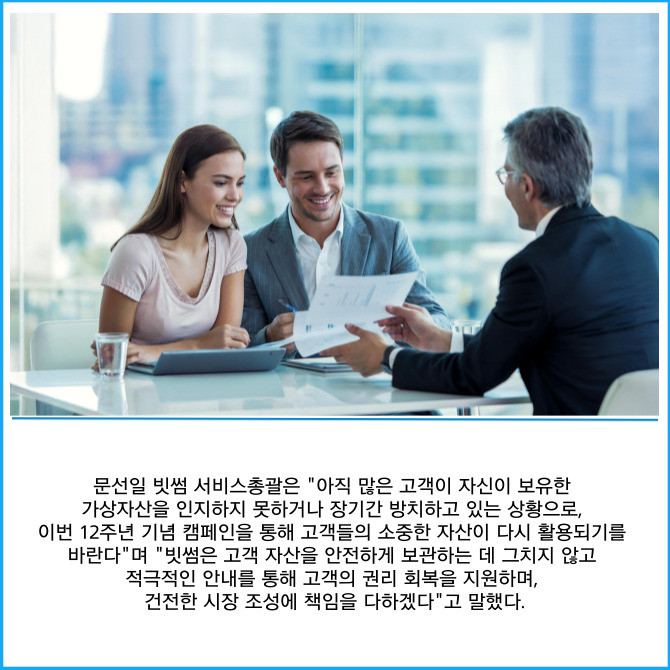 [프라임경제] 빗썸은 창립 12주년을 맞아 고객의 장기 미확인 자산을 안내하고 돌려주는 '휴면 자산 찾기' 캠페인을 진행한다고 31일 밝혔다.