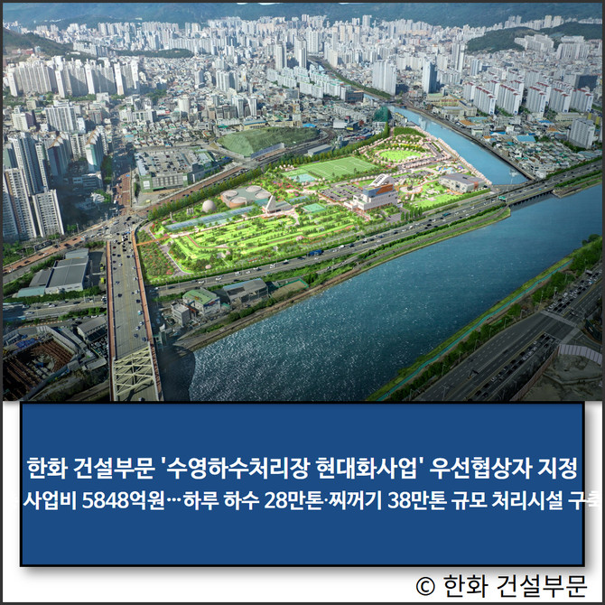 한화(000880) 건설부문이 지난 29일 총 사업비 5848억원 규모의 '수영하수처리장 현대화사업' 우선협상자로 선정됐다.