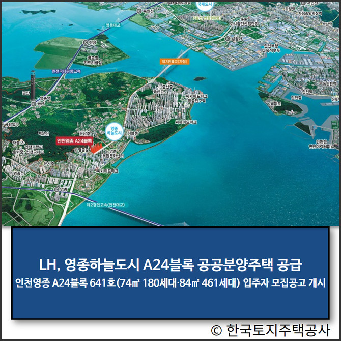 한국토지주택공사(LH)가 31일 영종하늘도시 운남동 일원에 위치한 인천영종 A24블록 공공분양주택의 입주자 모집공고를 시행한다고 밝혔다.
