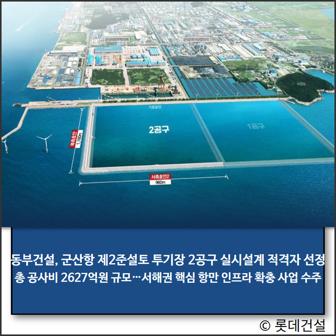 동부건설은 해양수산부 군산지방해양수산청이 턴키 방식(설계·시공 일괄입찰)으로 발주한 '군산항 제2준설토투기장(2공구) 축조공사'의 실시설계 적격자로 선정됐다고 31일 밝혔다.
