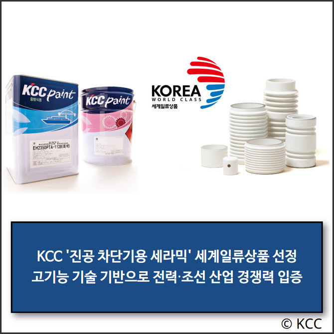 KCC(002380)의 진공 차단기용 세라믹, 선박용 에폭시 방청 도료, 방오 도료 3개 품목이 2025년 세계일류상품으로 선정됐다. 진공 차단기용 세라믹과 선박용 에폭시 방청 도료는 17년 연속, 방오도료는 15년 연속 선정됐다.