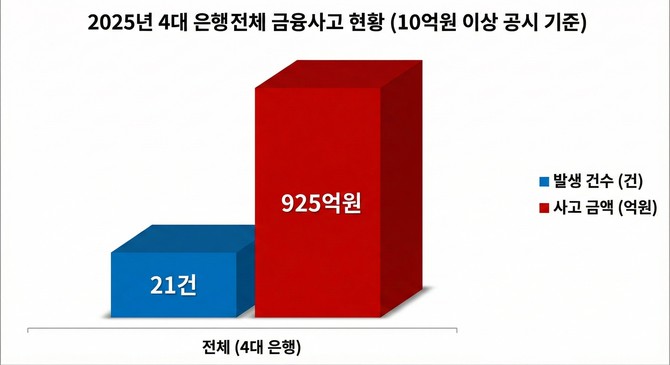 공시를 취합한 결과, 올해 국내 4대(신한·국민·하나·우리) 은행에서 발생한 10억원 이상의 금융사고는 총 21건이다. 사고 금액은 약 925억원에 달한다.