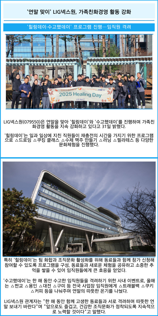 [프라임경제] LIG넥스원(079550)은 연말을 맞아 '힐링데이'와 '수고했데이'를 진행하며 가족친화경영 활동을 지속 강화하고 있다고 31일 밝혔다.