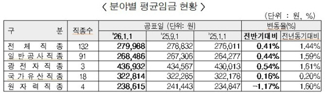 국가유산 직종(18개)의 일 평균 임금은 32만2814원으로 전년 동기 대비 0.20%, 직전 반기 대비 0.16% 각각 상승했다. 원자력 직종(4개)은 23만8615원으로 전년 동기 대비 1.60% 올랐으나, 직전 반기와 비교해서는 1.17% 하락한 것으로 나타났다.