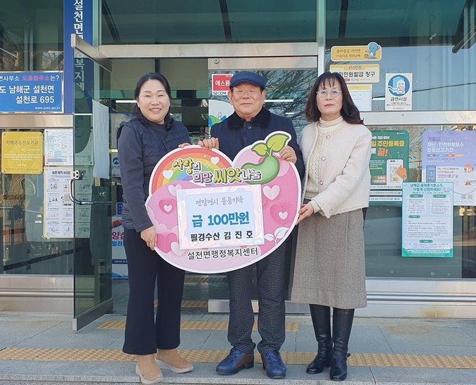 필경수산(대표 김진호)은 지난 2일 설천면 행정복지센터(면장 이채현)를 찾아 관내 도움의 손길이 필요한 이웃들을 위해 사용해 달라며 성금 100만원을 기탁했다.