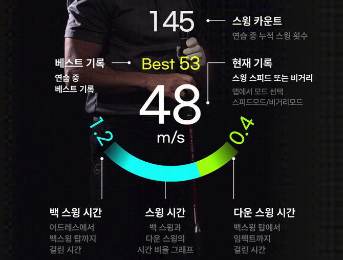 또 스윙 후에는 △스윙스피드 △스윙스피드 기반 예상 캐리거리 △백스윙 다운스윙 구간별 시간 데이터가 즉시 제공됨으로써 사용자는 단순 반복이 아닌 자신의 스윙 리듬과 템포 변화를 수치로 확인하며 연습할 수 있다.