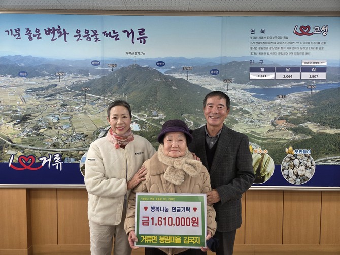 고성군 거류면 봉림마을에 거주하는 김국자(85) 할머니는 지난 12월31일 자녀들과 함께 거류면사무소를 방문해 지역의 소외된 이웃에 따듯한 온정의 손길을 전달해 달라며 성금 161만원을 기탁했다고 5일 밝혔다.