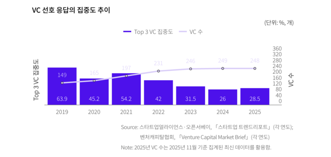 하지만 이후 해당 비중은 2020년 45.2%, 2021년 54.2%를 거쳐 2022년 42%로 낮아졌고, 2024년에는 26%까지 떨어졌다. 지난해에는 28.5% 수준에 머물며 과거와 같은 '소수 VC 쏠림 현상'은 뚜렷하게 완화됐다.