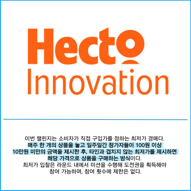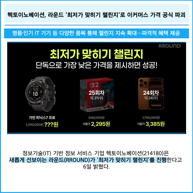 [프라임경제] 정보기술(IT) 기반 정보 서비스 기업 헥토이노베이션(214180)은 새롭게 선보이는 라운드(RROUND)가 '최저가 맞히기 챌린지'를 진행한다고 6일 밝혔다.