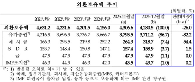 [프라임경제] 12월 우리나라 외환보유액이 26달러 감소하면서 7개월 만에 하락 전환했다. 1500원을 위협하는 고환율에 외환당국이 달러 매도 개입, 국민연금과의 외환스와프도 가동된 영향이다. 다만 금융기관의 외화예수금 증가, 기타 통화의 달러 환산액이 늘며 감소폭은 다소 축소됐다.