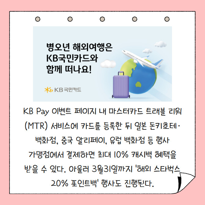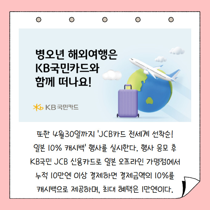 [프라임경제] KB국민카드가 병오년 새해를 맞아 해외 여행을 준비하는 고객들을 위해 캐시백과 포인트리 제공 행사를 진행한다. KB국민 트래블러스 체크카드 고객 대상으로 3월31일까지 '트래블러스체크카드 캐시백 혜택모음.zip' 이벤트를 실시한다.