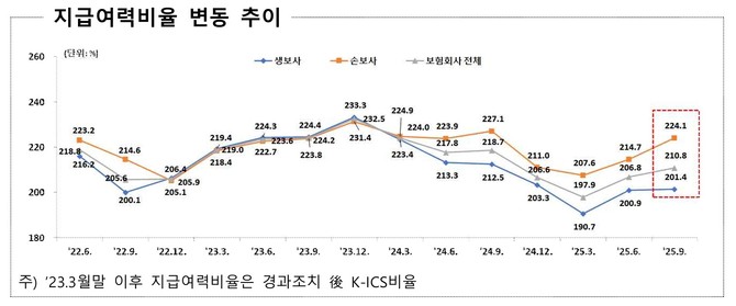 금융당국은 지급여력비율 개선 흐름에도 불구하고 시장 변동성에 대한 경계를 늦추지 않고 있다. 금감원 관계자는 "최근 금리 변동성이 확대되고 있는 만큼 자산·부채관리(ALM)를 통해 금리 리스크를 최소화할 필요가 있다"며 "손해율 악화가 보험부채 증가로 이어질 수 있는 점을 고려해 취약 회사를 중심으로 리스크 관리 감독을 강화할 계획"이라고 말했다.