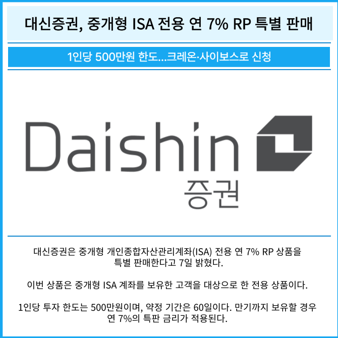 [프라임경제] 대신증권(003540)은 중개형 개인종합자산관리계좌(ISA) 전용 연 7% RP 상품을 특별 판매한다고 7일 밝혔다.