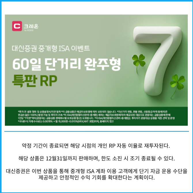 [카드] 대신증권, 중개형 ISA 전용 연 7% RP 특별 판매