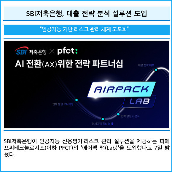 [프라임경제] SBI저축은행이 인공지능 신용평가·리스크 관리 솔루션을 제공하는 피에프씨테크놀로지스(이하 PFCT)의 '에어팩 랩(Lab)'을 도입했다고 7일 밝혔다.