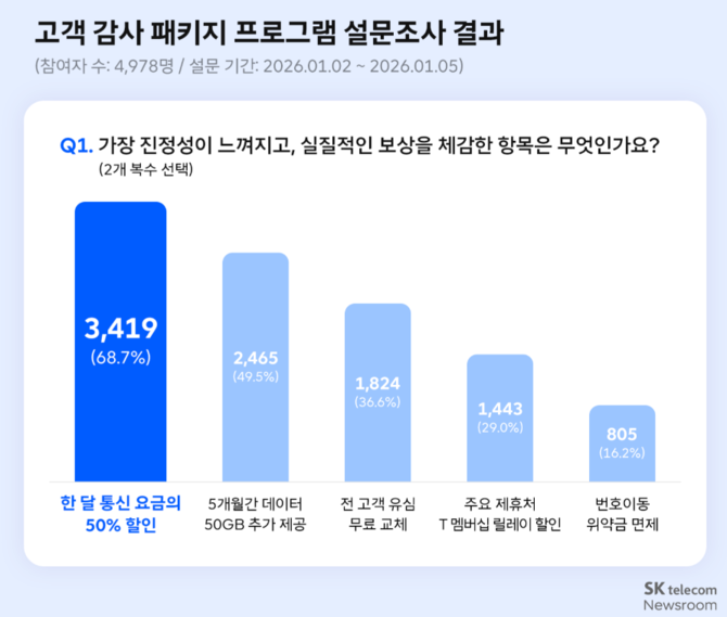 7일 SK텔레콤에 따르면 지난 2일부터 5일까지 고객 4978명을 대상으로 설문조사를 실시한 결과, 응답자의 68.7%(3419명)가 '8월 한 달 요금 50% 할인'을 가장 체감 효과가 컸던 보상안으로 꼽았다.