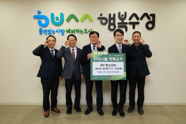 수성구청은 기탁받은 성금을 '희망수성 천사계좌'에 적립해 관내 소외계층을 위한 생계비·의료비 지원 등 다양한 복지사업에 사용할 계획이다.