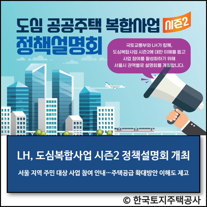 한국토지주택공사(LH)는 국토교통부와 함께 오는 13·15·16일 서울시 권역생활권별 지역 주민을 대상으로 ‘도심복합사업 시즌2 찾아가는 정책설명회’를 개최한다고 7일 밝혔다.