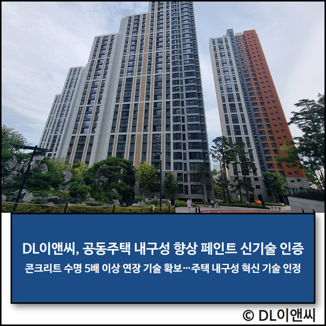 DL이앤씨 관계자는 "공동주택 내구성 향상 페인트 기술은 건축물 유지 관리를 위한 사회적 비용 절감과 탄소 배출량 저감에 기여할 수 있는 친환경 기술"이라며 "지속 가능한 건축 기술 개발을 통해 고객에게 더 안전하고 오래가는 주거 가치를 제공해 나갈 것"이라고 전했다.