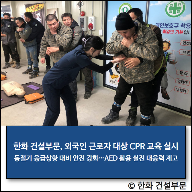 김윤해 한화 건설부문 안전환경경영실장은 "동절기에는 강추위로 인해 심혈관 질환을 비롯한 각종 응급 상황 발생 위험이 높아진다"라며 "이번 교육을 통해 외국인 근로자의 응급 상황 대응 역량이 한층 강화되길 기대한다"라고 전했다.