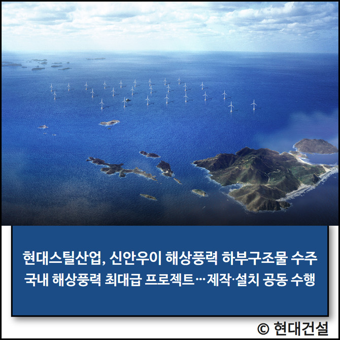 현대건설(000720)의 자회사 현대스틸산업은 전남 신안군 우이도 인근 해상에서 추진되는 '신안우이 해상풍력 발전단지(390MW)' 사업의 하부구조물 제작 및 설치 계약을 지난해 12월30일 한화오션(042660)과 체결했다고 7일 밝혔다. 계약 금액은 총 6115억원(제작2930억, 시공3185억)이다. 이는 국내 해상풍력 시장에서 보기 드문 대규모 프로젝트다.