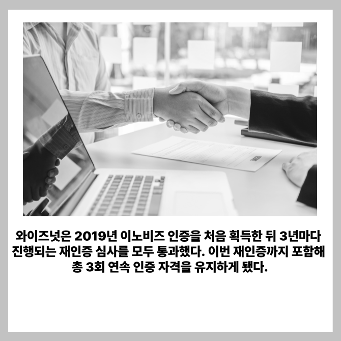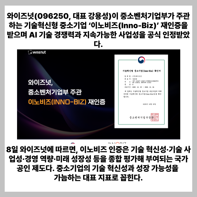 8일 와이즈넛에 따르면, 이노비즈 인증은 기술 혁신성·기술 사업성·경영 역량·미래 성장성 등을 종합 평가해 부여되는 국가 공인 제도다. 중소기업의 기술 혁신성과 성장 가능성을 가늠하는 대표 지표로 꼽힌다.