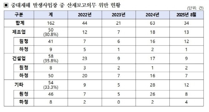 실제 산업재해 보고의무 위반 사례에서도 건설업 비중은 높게 나타났다. 고용노동부에 따르면 최근 4년간(2022년~2025년 8월) 적발된 산업재해 보고의무 위반 가운데 건설업이 차지하는 비율은 3분의 1을 넘었고, 중대재해가 발생한 사업장의 위반 사례도 꾸준히 증가했다.