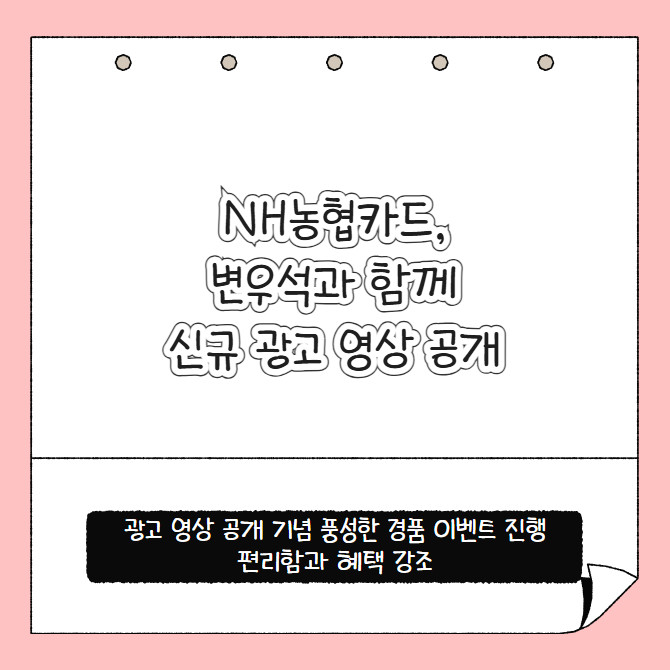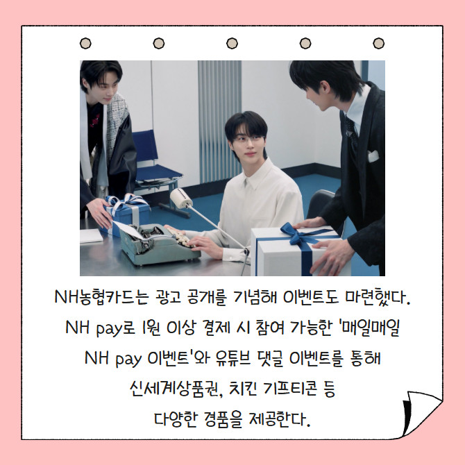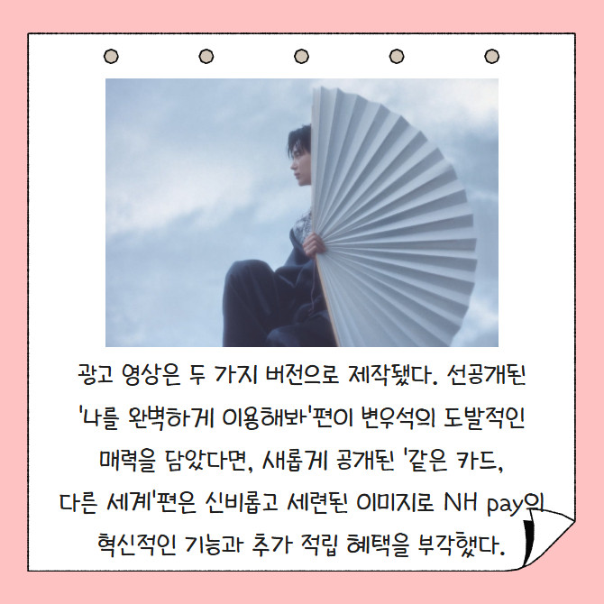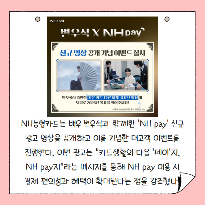 [프라임경제] NH농협카드는 배우 변우석과 함께한 'NH pay' 신규 광고 영상을 공개하고 이를 기념한 대고객 이벤트를 진행한다. 이번 광고는 "카드생활의 다음 '페이'지, NH pay지"라는 메시지를 통해 NH pay 이용 시 결제 편의성과 혜택이 확대된다는 점을 강조했다.