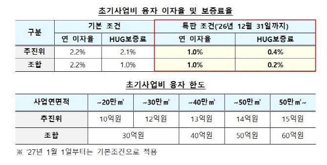 8일 국토교통부는 전국의 재건축·재개발 추진위원회와 조합을 대상으로 초기사업비 융자 이자율을 연 1.0%로 적용하는 한시 특판 상품을 출시한다고 밝혔다. 기존 연 2.2% 수준이던 이자율을 절반 이상 낮춘 것으로, 지난해 3월 제도 도입 이후 가장 파격적인 조건이다.