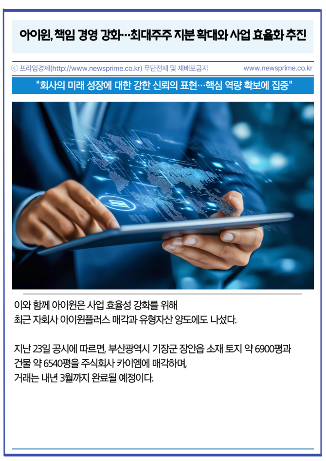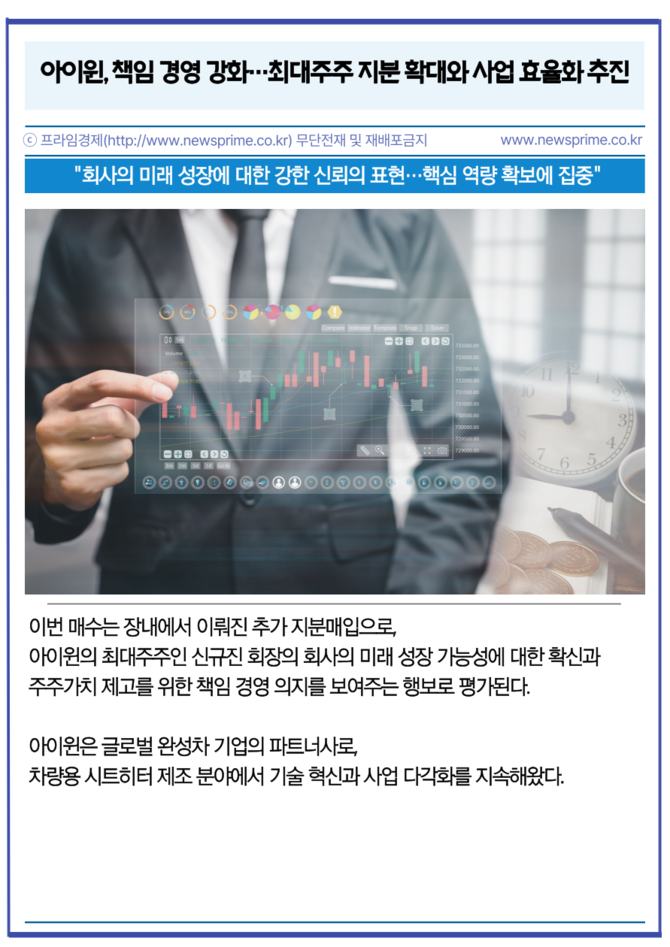 [프라임경제] 차량용 시트히터 제조 전문기업 아이윈(090150) 책임 경영 강화와 미래 성장 기반 마련을 위한 행보에 속도를 내고 있다. 아이윈은 지난 6일 공시를 통해 최대주주 신규진 회장이 지분을 추가 매입했다고 8일 밝혔다.