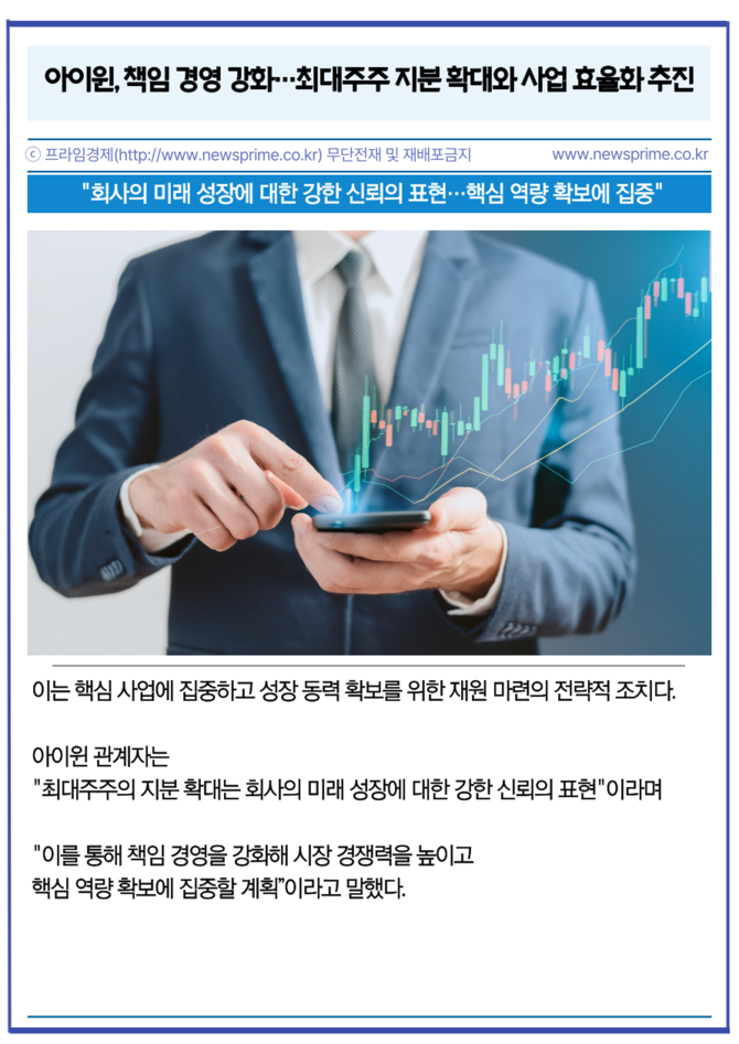 이번 매수는 장내에서 이뤄진 추가 지분매입으로, 아이윈의 최대주주인 신규진 회장의 회사의 미래 성장 가능성에 대한 확신과 주주가치 제고를 위한 책임 경영 의지를 보여주는 행보로 평가된다.