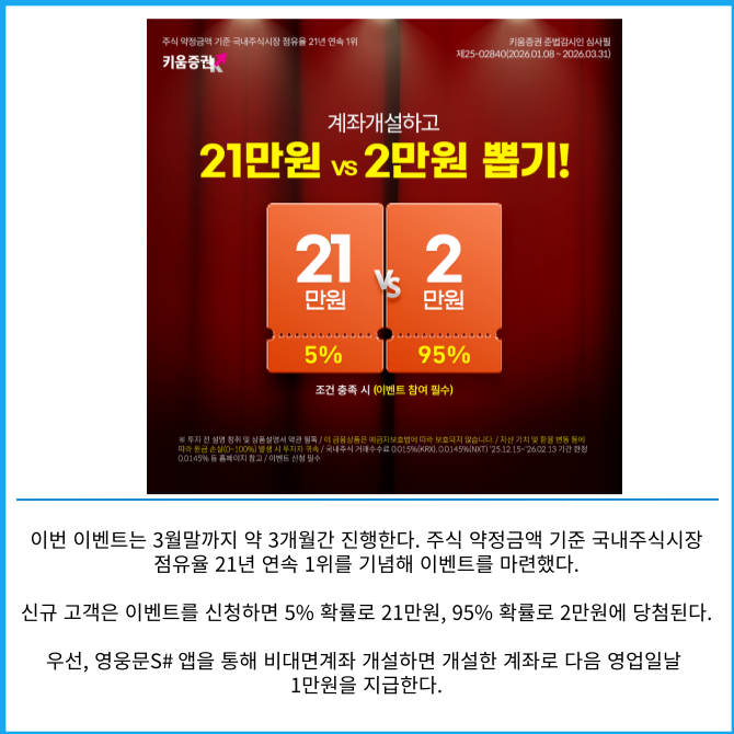 9일 키움증권은 생애 최초 신규고객이면서 모바일트레이딩시스템(MTS) 영웅문S#을 통해 비대면계좌를 개설한 고객을 대상으로 현금 최대 21만원을 지급하는 '계좌개설하고 21만원 vs 2만원 뽑기' 이벤트를 진행한다고 밝혔다.