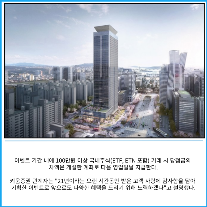[프라임경제] 키움증권(039490)이 국내주식시장 점유율 21년 연속 1위를 기념해 비대면계좌를 개설하면 현금을 지급하는 이벤트를 진행한다.