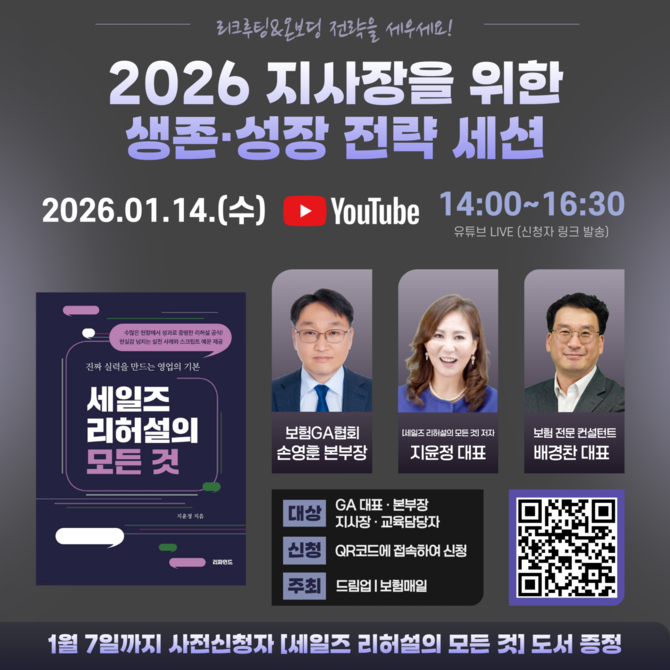 드림업과 보험매일은 오는 1월14일 오후 2시 '2026 GA 도약 세미나'를 개최한다고 9일 밝혔다. 세미나는 매출 경쟁을 넘어 시스템과 운영 역량 중심의 경쟁 환경에서 지사장이 판단해야 할 핵심 방향을 제시한다.