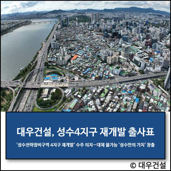 대우건설(047040)이 성수전략정비구역 4지구 재개발사업(성수4지구) 입찰 참여를 공식화하고 전사적 역량 투입 방침을 9일 밝혔다.