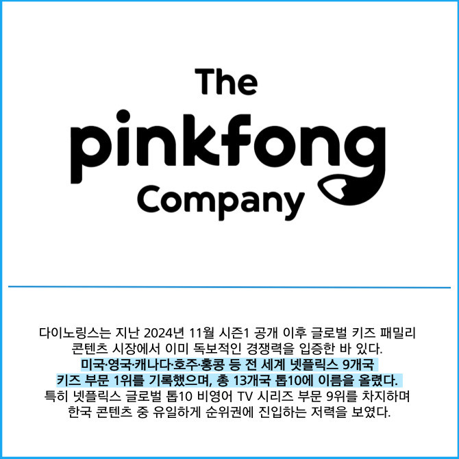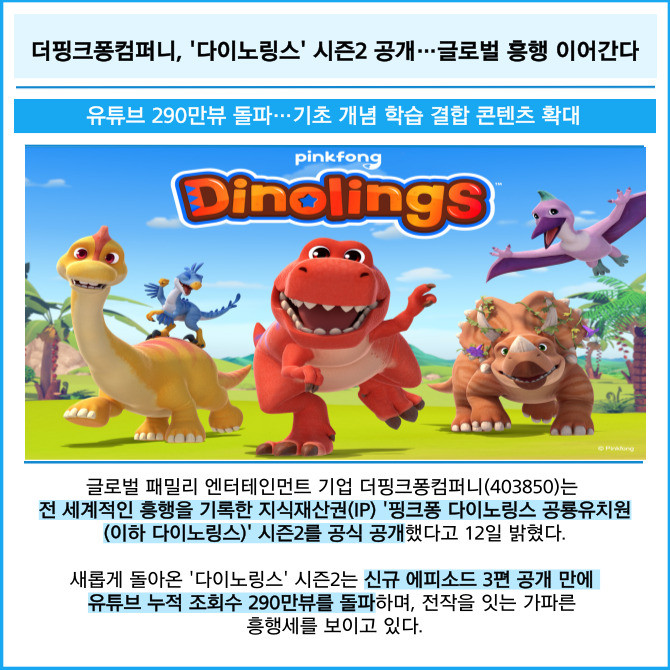 [프라임경제] 글로벌 패밀리 엔터테인먼트 기업 더핑크퐁컴퍼니(403850)는 전 세계적인 흥행을 기록한 지식재산권(IP) '핑크퐁 다이노링스 공룡유치원(이하 다이노링스)' 시즌2를 공식 공개했다고 12일 밝혔다.