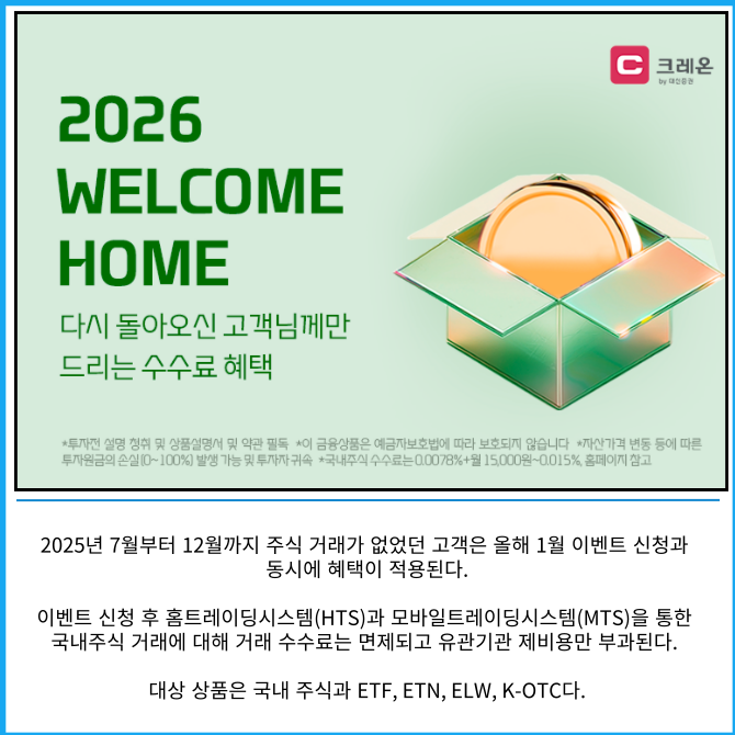 대신증권은 최근 6개월간 주식 거래가 없었던 고객을 대상으로 국내 주식 거래 수수료 혜택을 제공하는 '2026 웰컴홈 이벤트'를 실시한다고 12일 밝혔다.