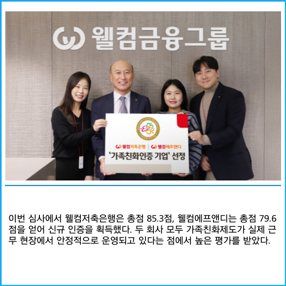 [카드] 웰컴저축은행·웰컴에프앤디, 가족친화인증기업 선정