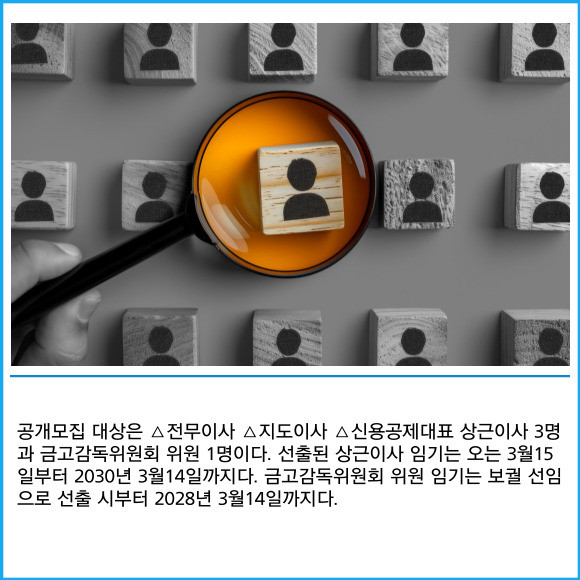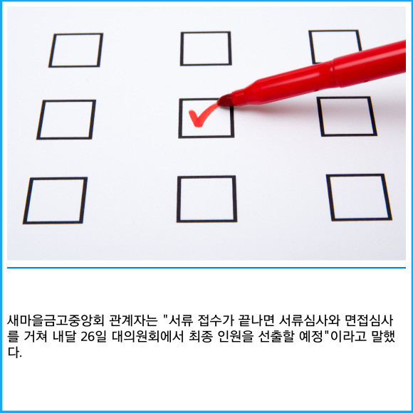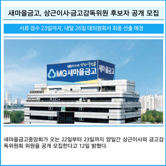 [프라임경제] 세마을금고중앙회가 오는 22일부터 23일까지 양일간 상근이사와 금고감독위원회 위원을 공개 모집한다고 12일 밝혔다.