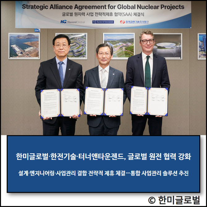 한미글로벌(053690)은 한국전력기술, 터너앤타운젠드와 함께 글로벌 원전 사업 기회 창출을 위한 전략적 제휴 협약(SAA)을 체결했다고 12일 밝혔다.