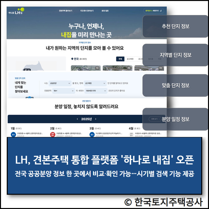 김재경 LH 경영관리본부장은 "하나로 내집 플랫폼은 누구나 편리하게 전국 공공분양주택 정보를 한눈에 확인할 수 있는 새로운 창구"라며 "앞으로도 고객 중심의 업무 편의 제고를 위해 노력하겠다"라고 말했다.